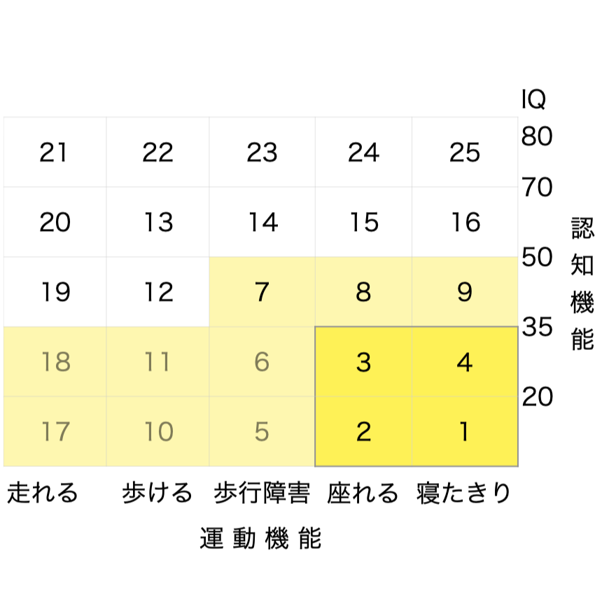 重症心身障害の判定基準として,東京都立府中療育センター元院長の大島一良医師が考案した大島分類(1968年)が長く用いられてきました。当初は大島分類1~4が重症心身障害児とされました。